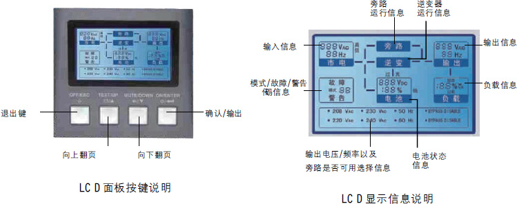LCD中英文顯示面板,向用戶準確地顯示UPS工作環(huán)境和工作狀況信息,在LCD顯示面板上設(shè)置輸出電壓和頻率,方便用戶操作。