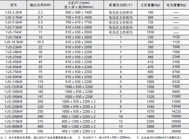 YJS系列EPS電池配置及尺寸重量一覽表