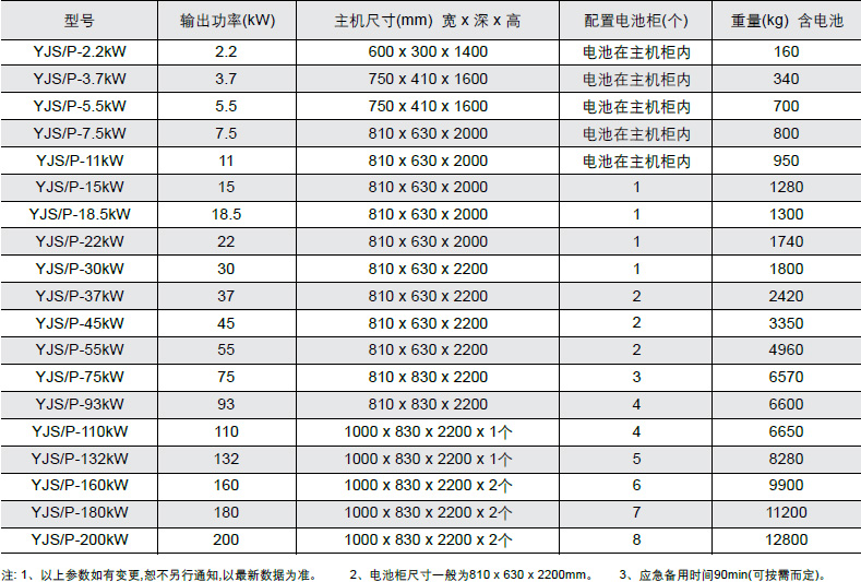 YJS/P系列EPS電池配置及尺寸重量一覽表